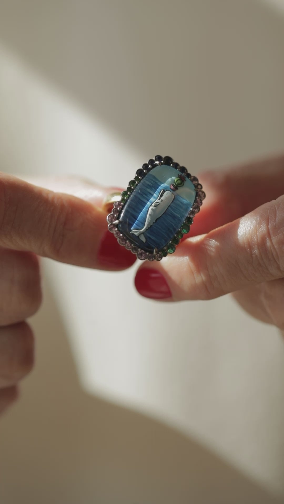 18k Yellow Gold (7.25gr), Sapphires (0.06ct), Emeralds (0.02ct), Tsavorites (0.09), Amethyst Rock Crystal, Cabochon carved and painted by hand.